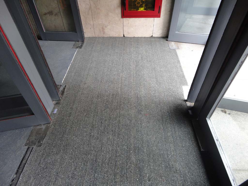 Per questo stabile in zona Farini a Milano abbiamo realizzato uno zerbino in cocco grigio (Nostro articolo 105). E’ stato sagomato in magazzino dal nostro staff così da inserirlo nell’apposito riquadro. Il colore è stato scelto per rispecchiare la pavimentazione interna ed i profili delle porte.